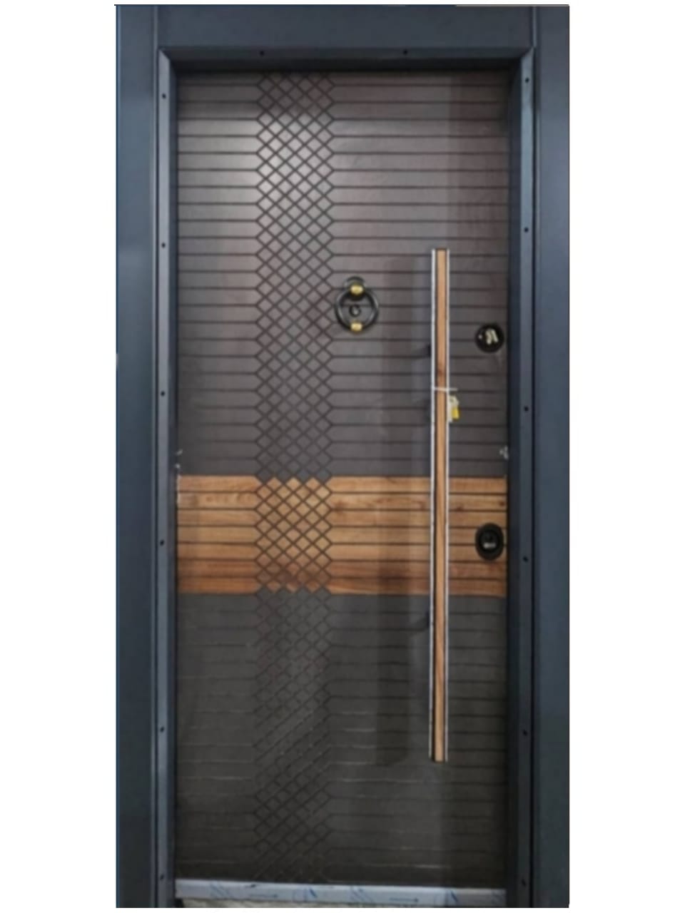 • 4 lock • Stainless steel threshold • Stainless steel handle • With magic eye • Fully armored • PVC water resistant layer • 12 mm wooden layer • 2 mm inner armor thickness (double) • 1.5 mm door sheet thickness • The same shape on both sides •Additional supports •Higher sound insulation Sizes: • 100*215*17cm • Door thickness is 11 cm • Frame thickness 17 cm • Weight 180 kg ★ Installation fees will be added